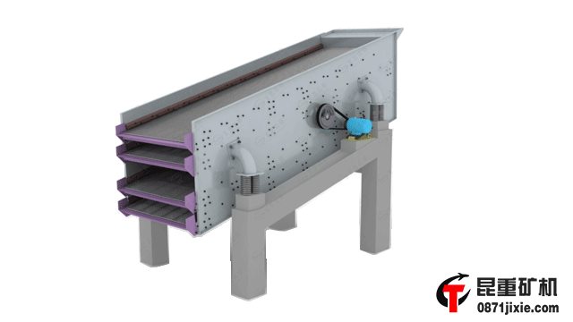 圓振動篩工作時,電動機經(jīng)傳動器使激振器偏心塊產(chǎn)生高速旋轉(zhuǎn)。運轉(zhuǎn)的偏心塊產(chǎn)生很大的離心力,激發(fā)篩箱產(chǎn)生一定振幅的圓運動,篩上物料在傾斜的篩面上受到篩箱傳給的沖量而產(chǎn)生連續(xù)的拋擲運動,物料與篩面相遇的過程中使小于篩孔的顆粒透篩,從而實現(xiàn)分級。